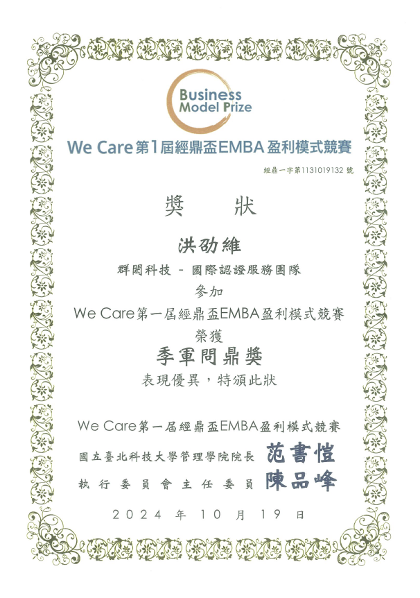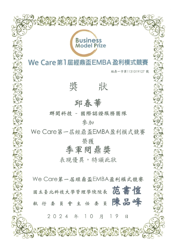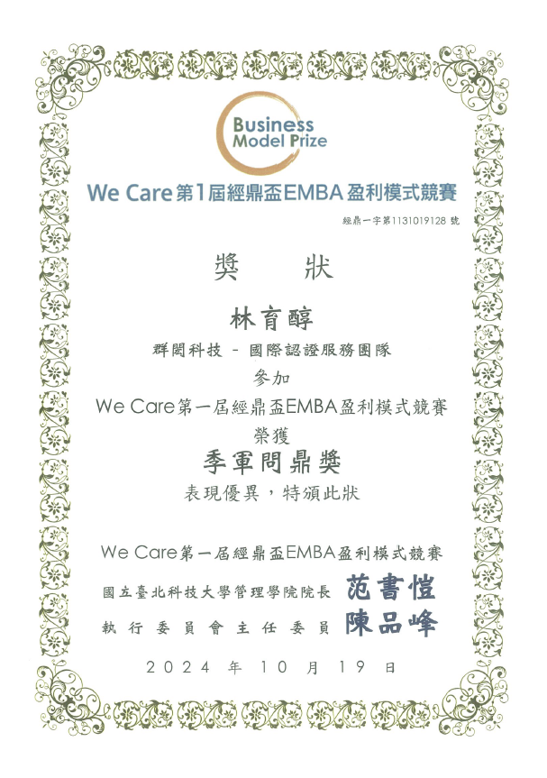 榮獲 第一屆經鼎盃EMBA盈利模式競賽 季軍問鼎獎